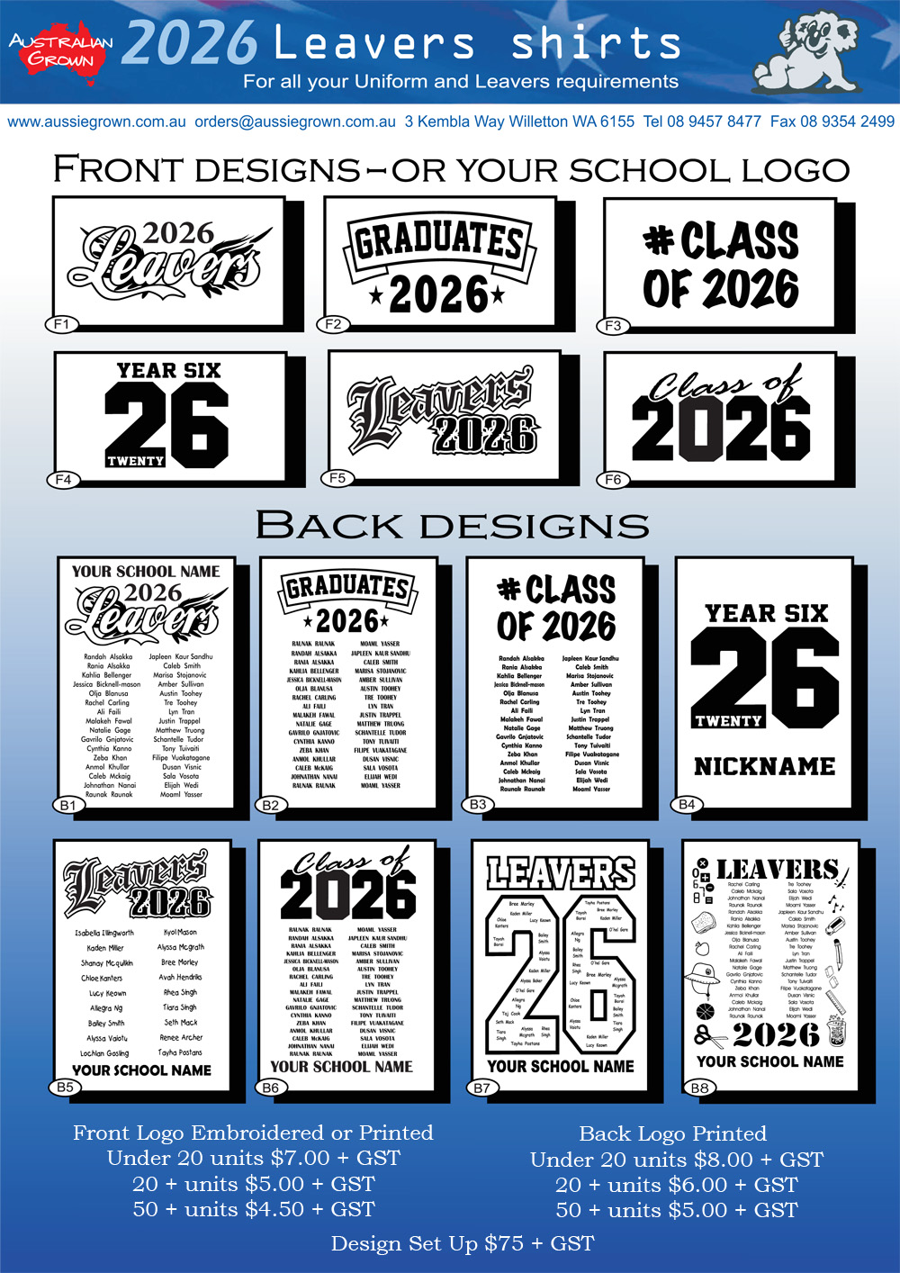 2026 School Leavers, Class and Graduate designs for polo shirts, tees and hoodies.