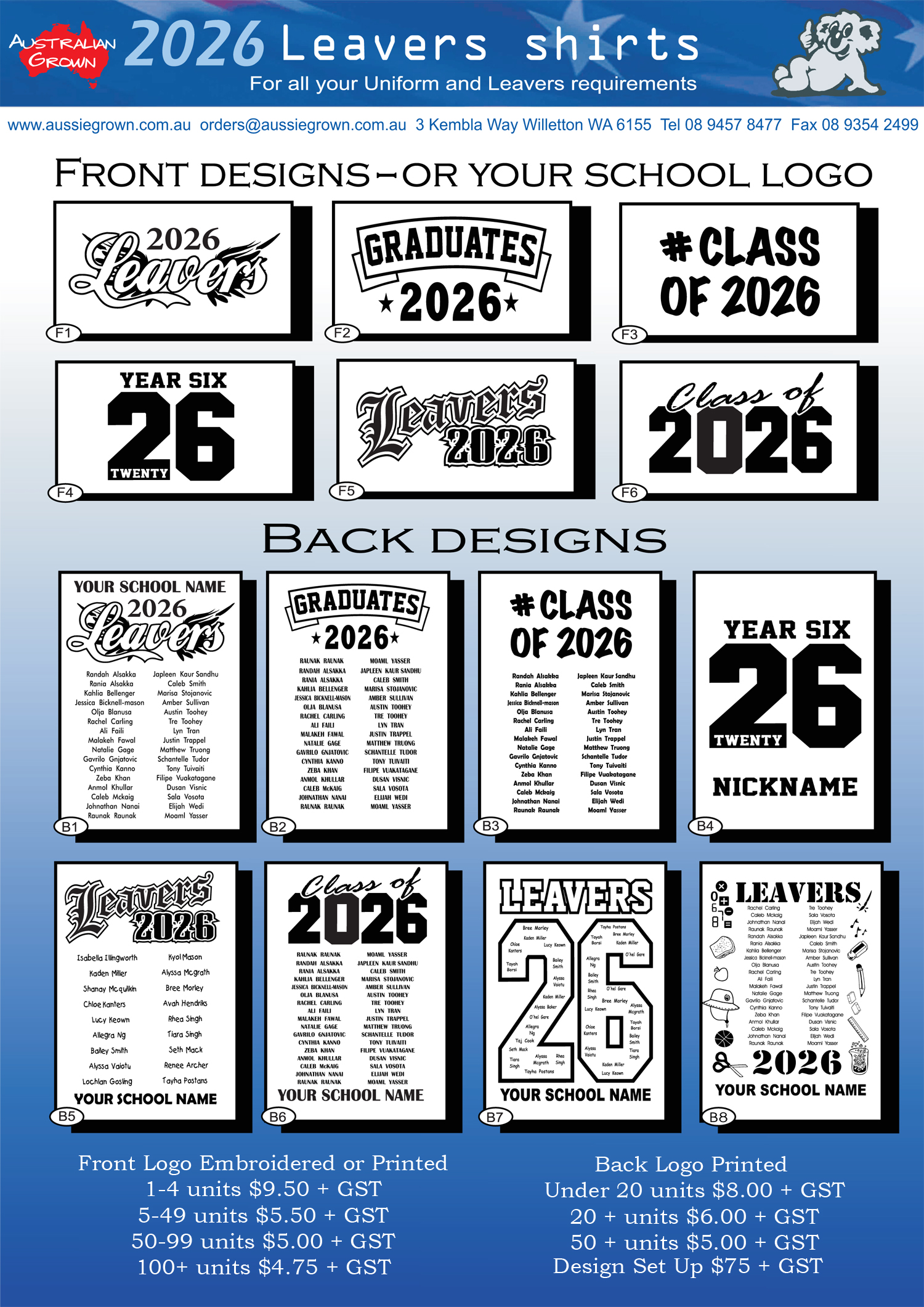 2026 School Leavers, Class and Graduate designs for polo shirts, tees and hoodies.